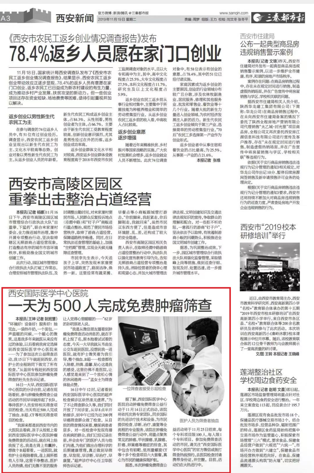三秦都市報(bào)報(bào)道—西安國(guó)際醫(yī)學(xué)中心醫(yī)院一天為500人完成免費(fèi)腫瘤篩查。點(diǎn)擊閱讀。