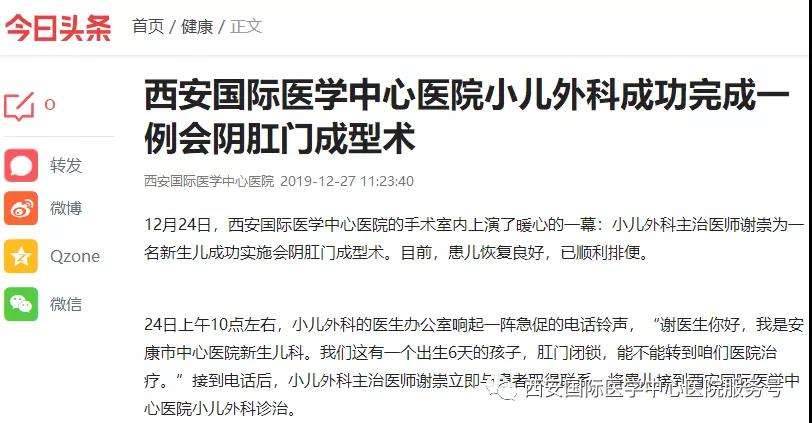 12月24日,西安國際醫(yī)學(xué)中心醫(yī)院的手術(shù)室內(nèi)上演了暖心的一幕:小兒外科主治醫(yī)師謝崇為一名新生兒成功實(shí)施會陰肛門成型術(shù)。目前,患兒恢復(fù)良好,已順利排便。