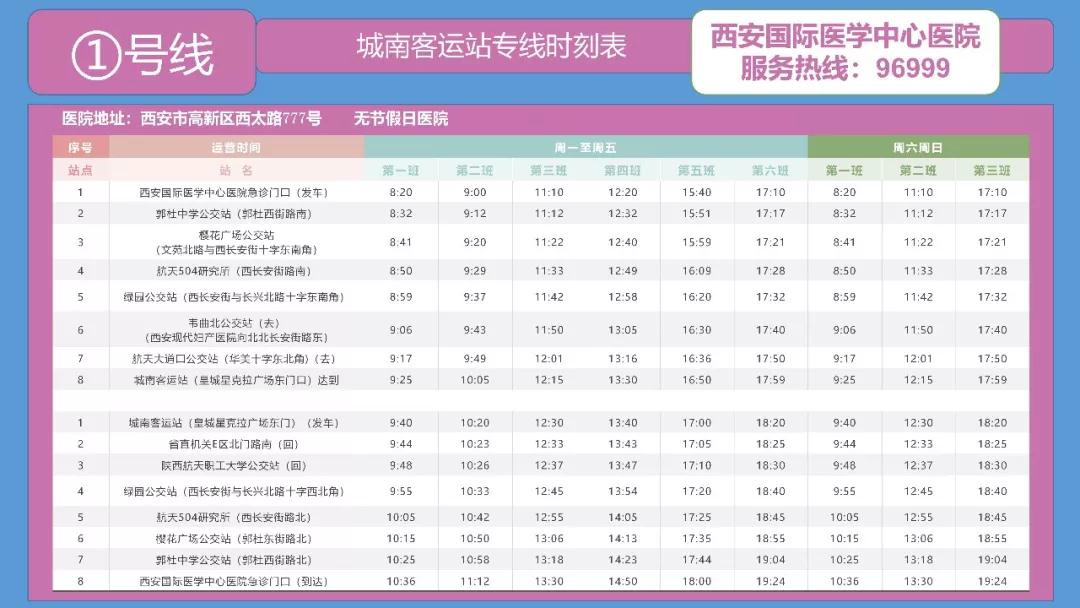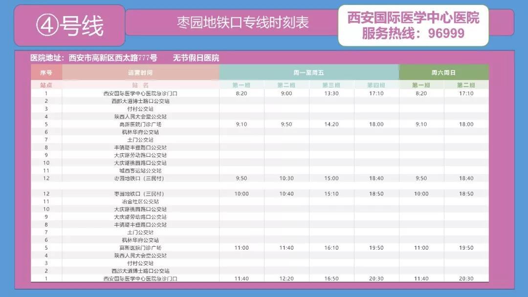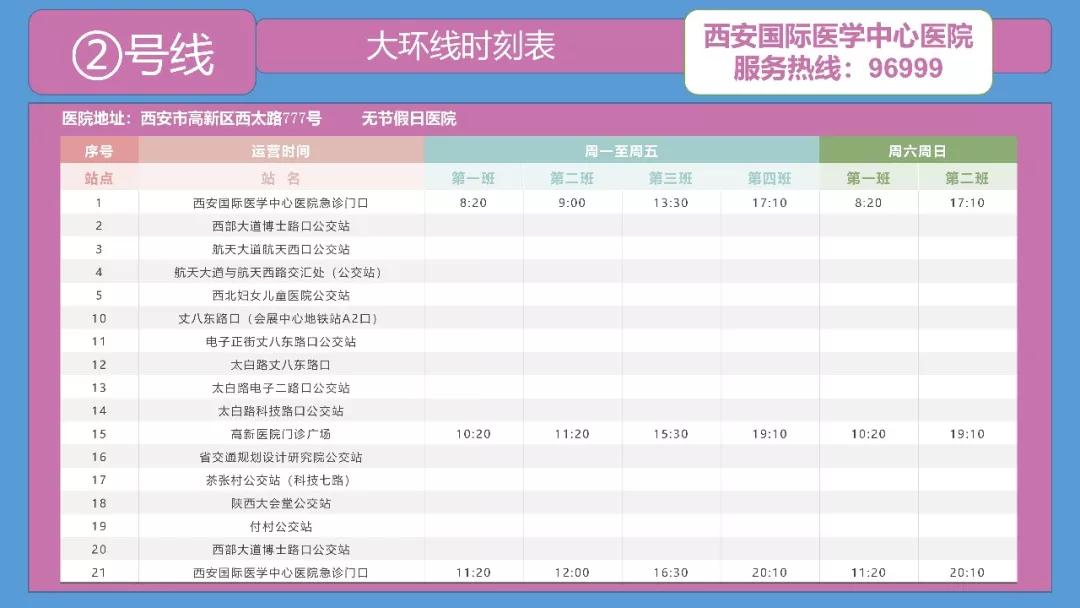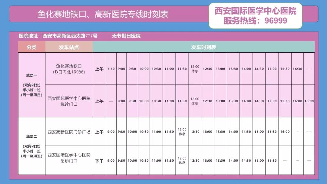 備注:西安國(guó)際醫(yī)學(xué)中心醫(yī)院——高新醫(yī)院運(yùn)行時(shí)間為:周一至周五。