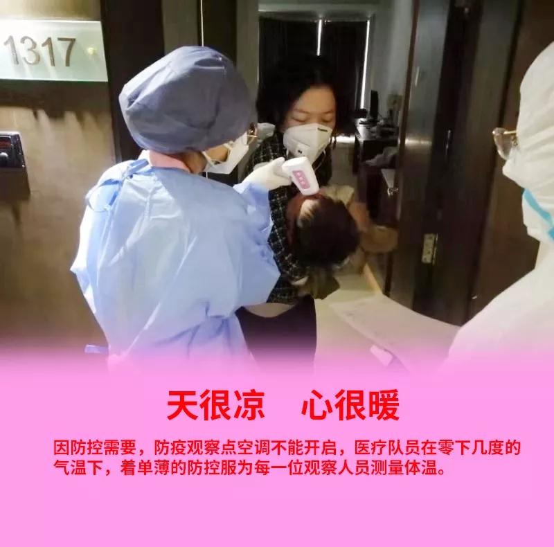 這支醫(yī)療隊(duì)由3名醫(yī)生、5名護(hù)士組成,分別是房武寧、張曉敏、王婧3位醫(yī)生;護(hù)士為白容容、陳蕓、王亞馨、燕瑞娥、田橋。身穿不透氣的防護(hù)服,醫(yī)護(hù)人員時(shí)時(shí)刻刻與時(shí)間拼耐心、與疫情變化拼細(xì)心。留觀人員中有16名70歲以上的老人,6名3歲以下的兒童。他們體質(zhì)較弱,需要更多的關(guān)懷與呵護(hù)。護(hù)士王亞馨每天要在樓上往返7、8趟為他們測(cè)體溫、安撫情緒。“我也時(shí)常想念家人,春節(jié)沒法和他們一起過年?,F(xiàn)在,這里的老人和孩子就是我的家人?!闭f著,豆大的汗珠順著她的眼睫毛滑落。即便超負(fù)荷工作著,她也從未喊過苦叫過累。