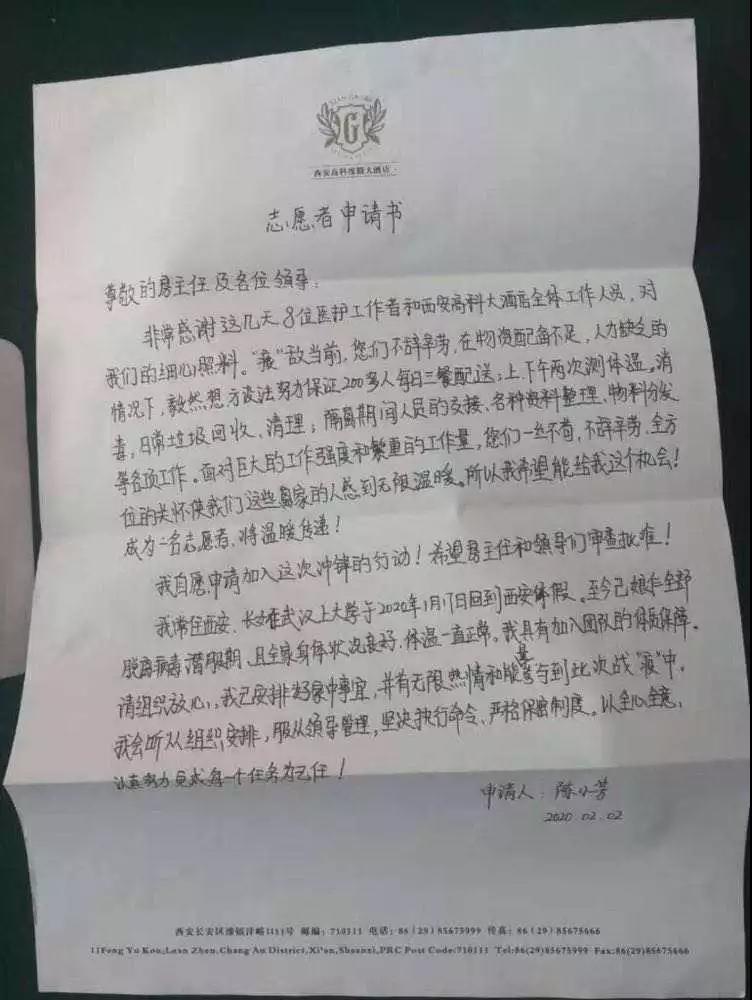 2月1日,解除留觀回家,陳小芳想當(dāng)志愿者的想法獲得了家人的鼓勵(lì)支持。緊接著,她向高新區(qū)留觀點(diǎn)臨時(shí)黨支部遞交了志愿者申請(qǐng)書。其中寫道:“面對(duì)巨大的工作強(qiáng)度和繁重的工作量,您們一絲不茍,不辭辛勞,全方位的關(guān)懷使我們這些離家的人感到無(wú)限溫暖。所以我希望我也能成為一名志愿者,將溫暖傳遞,我自愿申請(qǐng)加入這次沖鋒行動(dòng)!”