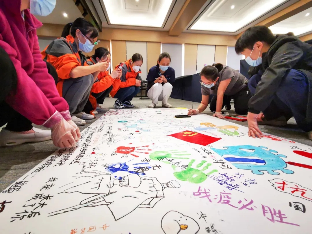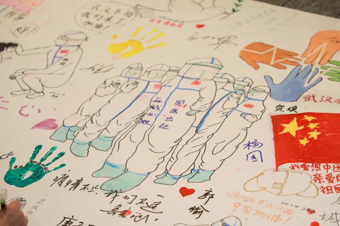 這兩幅畫板由醫(yī)療隊(duì)員和駐地的志愿者共同創(chuàng)作,一支支畫筆繪出全體人員戰(zhàn)“疫”祝福心聲:“武漢加油,中國必勝?!?/span>