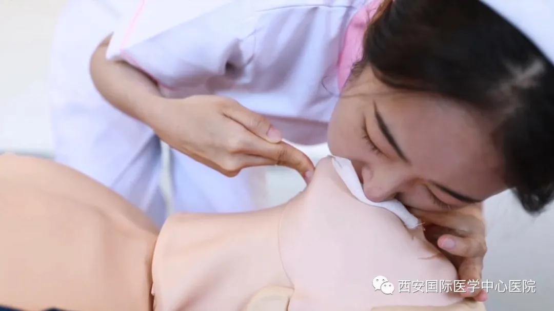 定位:雙乳頭連線的中點(diǎn),按壓的頻率一般是100--120次/分,按壓深度是5--6cm,胸外按壓30次后,頭偏向一側(cè)清除口腔分泌物,取出義齒,開放氣道:無頸椎損傷采取仰額抬頜法,如頸椎有損傷,采取抬舉下頜法暢通氣道。吹氣2次(注意:每口吹氣時捏鼻),每次吹氣時間1秒,量400-600ml,吹氣后松開鼻翼,看胸廓起伏。