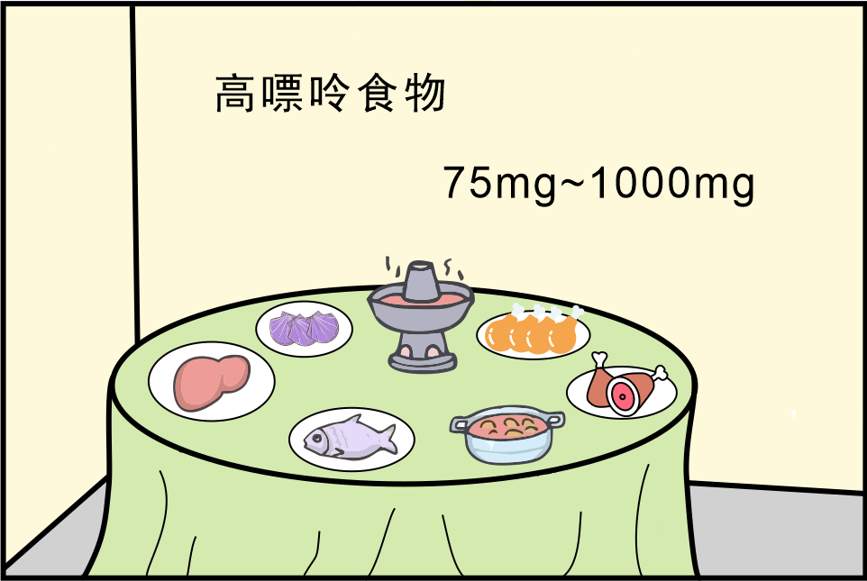 飲食控制:低嘌呤飲食,避免黨食用動物肝臟和腎臟等內(nèi)臟、貝類、牡蠣和龍蝦等帶甲殼的海產(chǎn)品及濃肉湯和肉汁等。