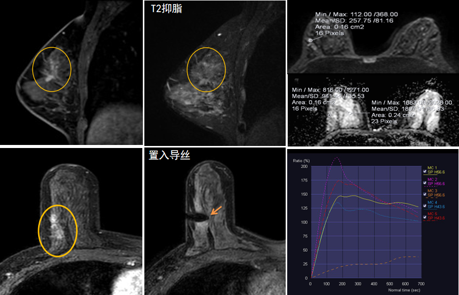 今年45歲的某女士,兩個月前行超聲檢查發(fā)現(xiàn)右乳結(jié)節(jié),乳腺X線攝影檢查提示右乳外上象限局部腺體結(jié)構(gòu)扭曲并簇狀無定形鈣化,為了進一步評估病變性質(zhì)并確定范圍進行了乳腺MR平掃 DWI 增強的檢查,經(jīng)MR評估發(fā)現(xiàn)右乳病變范圍較廣,評估為BI-RADS 4類可疑病變,需要取得病理學結(jié)果。