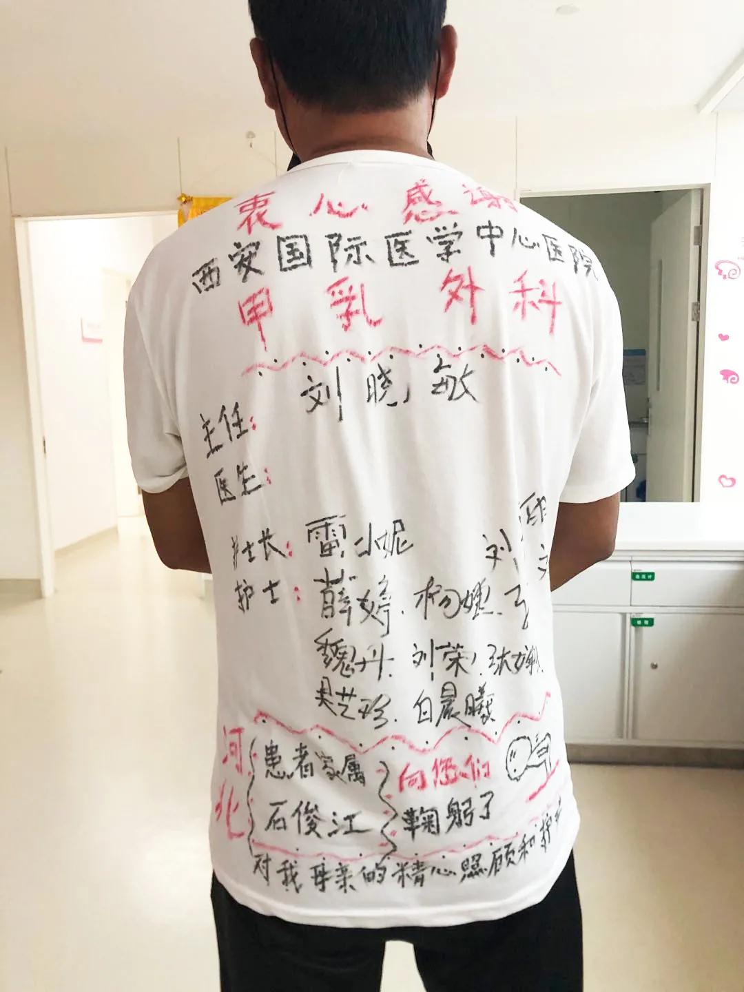 出院前一天,患者家屬想用一種特殊的方式記住醫(yī)生的恩情:“很感謝你們對我母親的照顧,你們在我這件襯衫上簽名,我開車?yán)浀臅r(shí)候就穿這件衣服,我走到哪里就念著你們到哪里,宣傳到哪里!我想讓更多人知道西安國際醫(yī)學(xué)中心這家醫(yī)院!這家醫(yī)院不僅就醫(yī)環(huán)境好,醫(yī)護(hù)人員的服務(wù)態(tài)度也很棒,我在這里就醫(yī),讓我感覺到前所未有的溫暖,我想讓那些同樣飽受病痛折磨的人早日得到身心解放,他們也能感受到溫暖?!?