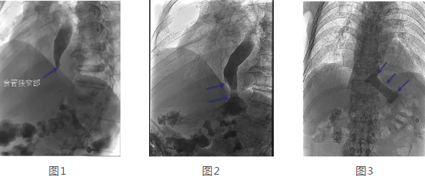 在韓國宏教授的帶領(lǐng)下,專家團隊經(jīng)多方面評估后,決定在DSA下為劉大爺行食管造影 食管支架置入術(shù)。術(shù)中透視可見食管中上段擴張明顯,食管下端賁門口明顯狹窄,造影劑淤積,呈線性緩慢進入胃腔(見圖1),經(jīng)過準確定位后,釋放食管支架,再次造影可見造影劑經(jīng)支架順利進入胃腔(見圖2)。2天后再次造影見食管支架完全打開,位置正常,造影劑可順利通過支架(見圖3)。