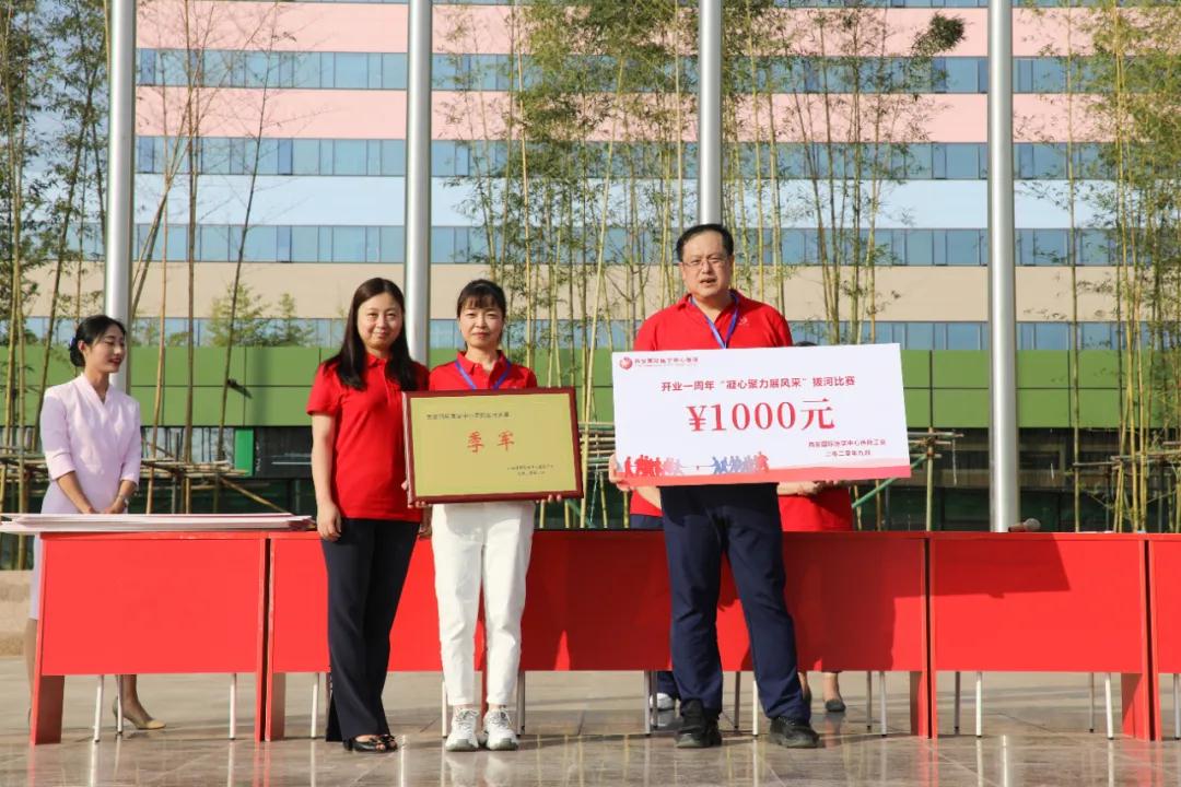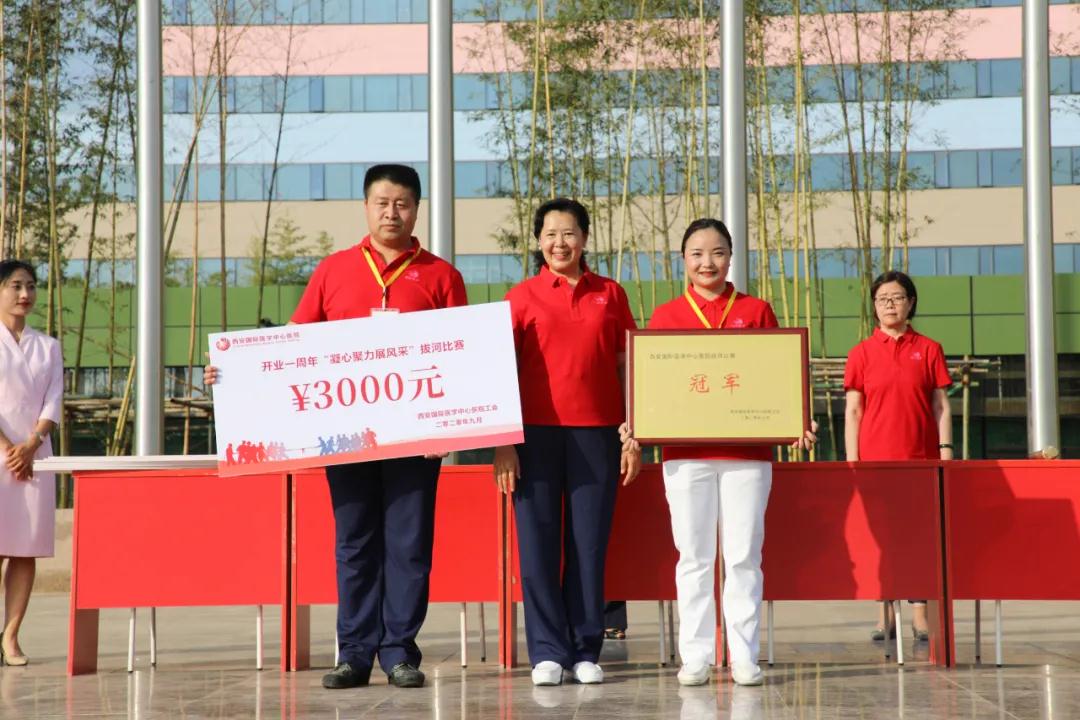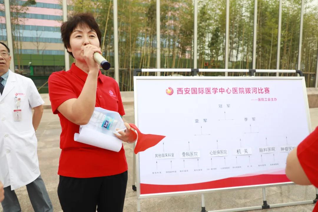 在院慶一周年之際,西安國際醫(yī)學(xué)中心醫(yī)院舉行“凝心聚力展風(fēng)采”拔河比賽,來自各機(jī)關(guān)部門、專科醫(yī)院、科室共有11支隊(duì)伍275名隊(duì)員參加。王志峰總經(jīng)理親臨現(xiàn)場(chǎng)觀摩活動(dòng)并為參賽隊(duì)員加油助威。