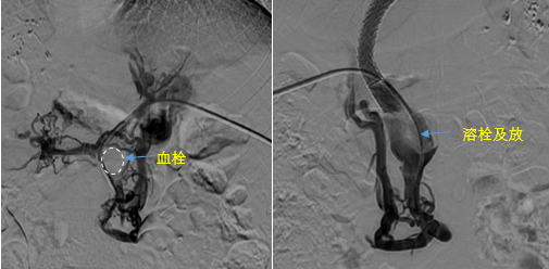 見此情形,韓國宏教授憑借豐富的臨床經(jīng)驗很快調(diào)整了策略,在超聲診療中心的協(xié)助下進(jìn)行門靜脈右支穿刺,并進(jìn)行造影,看到目標(biāo)血管后,韓國宏教授用“明修棧道,暗渡陳倉”的方法,讓來自脾臟和胃腸的血流終于暢通的回流到了肝靜脈。通過血流的沖刷以及抗凝溶栓藥物的作用,幾日后復(fù)查造影發(fā)現(xiàn)門靜脈血栓已逐漸變小,不會對回流到肝臟的血流產(chǎn)生大的阻礙作用,門靜脈的壓力顯著減小,患者再次出血的幾率也隨之降低。幾經(jīng)周折,這顆“定時炸彈”終于被拆除,李女士和她的家人多年來心里的石頭也終于落地。
