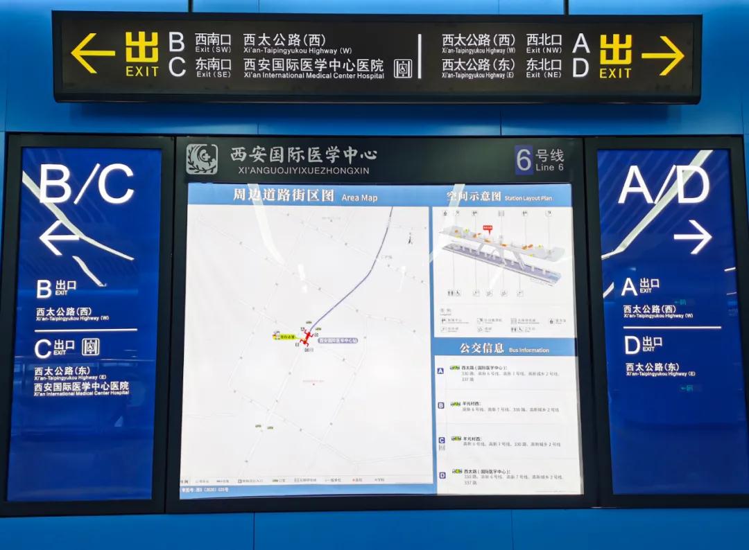 正式開通后,6號線西安國際醫(yī)學中心醫(yī)院站將開放4個地面出入口。主要分布在緯三十一和西太路口交匯處。地面C出口離西安國際醫(yī)學中心醫(yī)院2號門最近,僅20米就到醫(yī)院急診大樓前預檢處;地下通道C出口,通過閘機即到醫(yī)院A樓負二層。