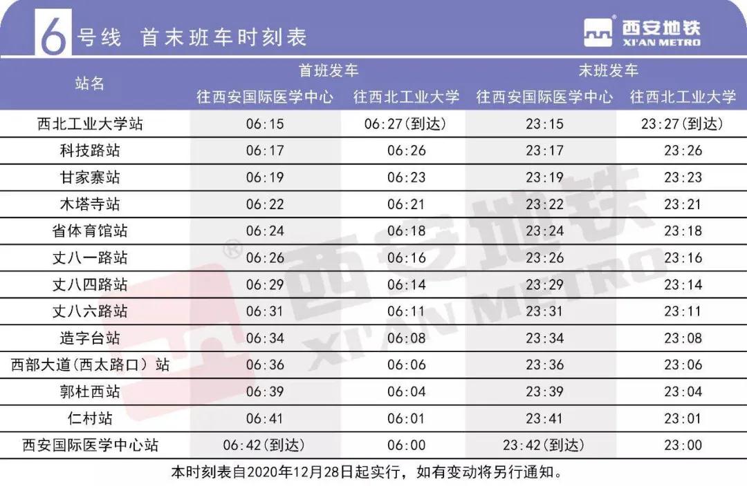 6號(hào)線一期開通初期全天開行單一交路,單程行駛時(shí)間為27分鐘。6號(hào)線一期西安國際醫(yī)學(xué)中心首末班車發(fā)車時(shí)間分別為6: 00、23: 00, 西北工業(yè)大學(xué)首末班車發(fā)車時(shí)間分別為6: 15、23: 15,全天運(yùn)營服務(wù)時(shí)間17小時(shí)43分。線路總體分布情況如圖: