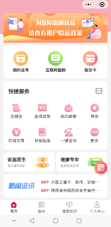1. 健康專車——距離不是問題!在線下單預(yù)約,健康專車為您提供方便快捷的來院、出院、轉(zhuǎn)院接送預(yù)約服務(wù)。目前該服務(wù)處于試運(yùn)營(yíng)期間,均可免費(fèi)體驗(yàn)哦。