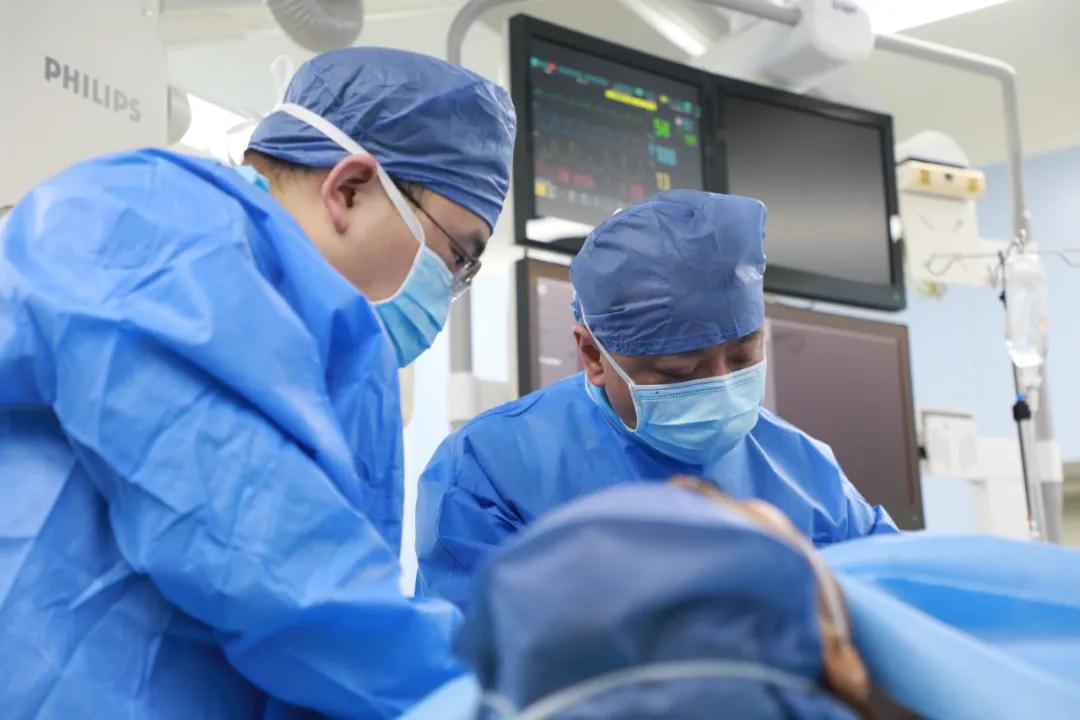 按照術前制定的方案,郭穎強主任和楊金保博士首先嘗試開通閉塞的右腎動脈,但由于血栓機化、鈣化嚴重,右腎動脈難以開通。遂謹慎擴張狹窄的左腎動脈,并成功植入一枚支架。之后經(jīng)過反復旋磨、抽吸,順利開通髂動脈,但腹主動脈閉塞段仍難以擴通。此時,患者居高不下的血壓很快恢復到正常水平。