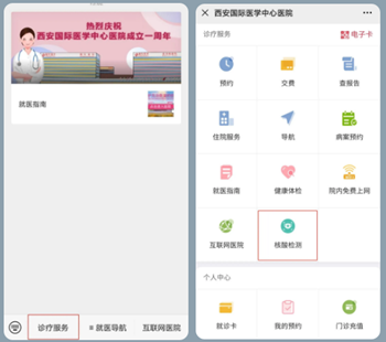 為方便患者進(jìn)行核酸檢查,我院開(kāi)通核酸檢測(cè)網(wǎng)上預(yù)約,并免掛號(hào)費(fèi)用,患者可通過(guò)西安國(guó)際醫(yī)學(xué)中心醫(yī)院服務(wù)號(hào)進(jìn)行預(yù)約和自助繳費(fèi)。