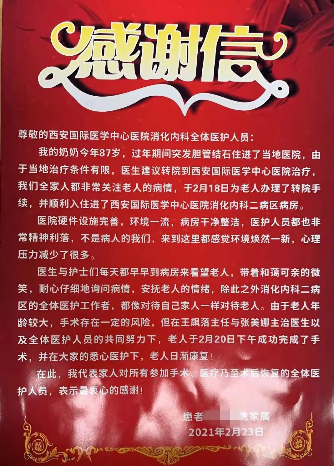 “醫(yī)生與護士們每天都早早到病房看望老人,耐心仔細詢問病情,安撫老人情緒……我代表家人對全體醫(yī)護人員表示最衷心的感謝!”出院當天,岳奶奶的兒女將感謝信與錦旗送到消化內科二病區(qū)醫(yī)護人員手中。