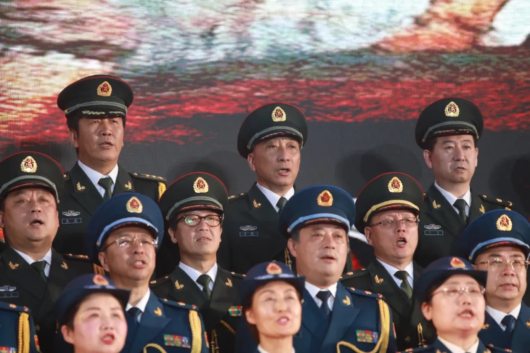 “一二一”,演出開始,由71名退役軍官組成的退役軍人合唱團(tuán),在尹強(qiáng)院長的帶領(lǐng)下,邁著整齊的步伐,喊著響亮的口號,雄赳赳,氣昂昂走上舞臺。