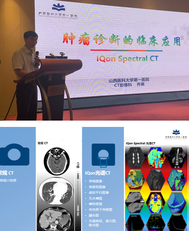 授牌儀式后即開(kāi)始精彩的學(xué)術(shù)講座,首先,山西醫(yī)科大學(xué)第一醫(yī)院影像科喬英教授分享了“IQon光譜CT在腫瘤診斷的臨床應(yīng)用”。喬教授指出IQon Spectral CT的光譜重建可以提供多參數(shù)數(shù)據(jù),如單能級(jí)圖像、無(wú)水碘圖、有效原子序數(shù)值等,更加清晰的觀察病灶范圍,更加精準(zhǔn)的發(fā)現(xiàn)小病灶、進(jìn)行腫瘤分期及術(shù)后療效評(píng)估。