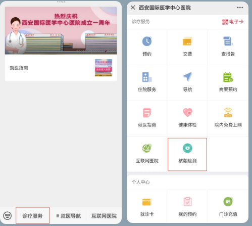 醫(yī)院核酸檢測(cè)已開(kāi)通線上預(yù)約,大家可通過(guò)“西安國(guó)際醫(yī)學(xué)中心醫(yī)院服務(wù)號(hào)”微信公眾號(hào)進(jìn)行預(yù)約。
