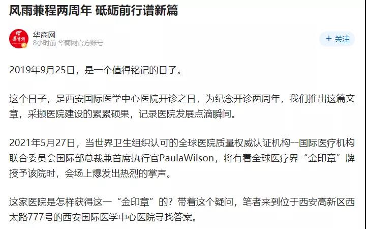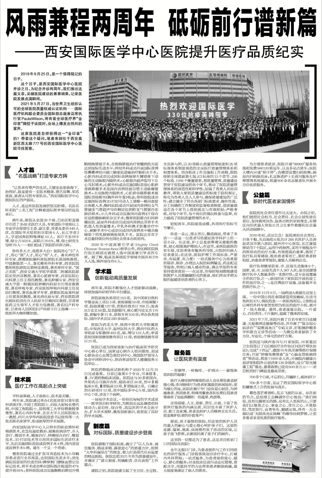 今日《華商報(bào)》A8版用整版的篇幅刊登了《風(fēng)雨兼程兩周年 砥礪前行譜新篇——西安國(guó)際醫(yī)學(xué)中心醫(yī)院提升醫(yī)療品質(zhì)紀(jì)實(shí)》。華商報(bào)以圖文并茂的形式記錄了醫(yī)院建設(shè)的點(diǎn)滴瞬間,全方位、多角度報(bào)道了醫(yī)院兩年來(lái)的發(fā)展碩果。