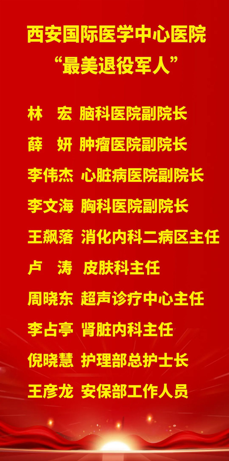 李武平副院長宣讀了表彰名單,林宏、薛妍、李偉杰、李文海、王飆落、盧濤、周曉東、李占亭、倪曉慧、王彥龍10名同志被評為“西安國際醫(yī)學(xué)中心醫(yī)院最美退役軍人”。