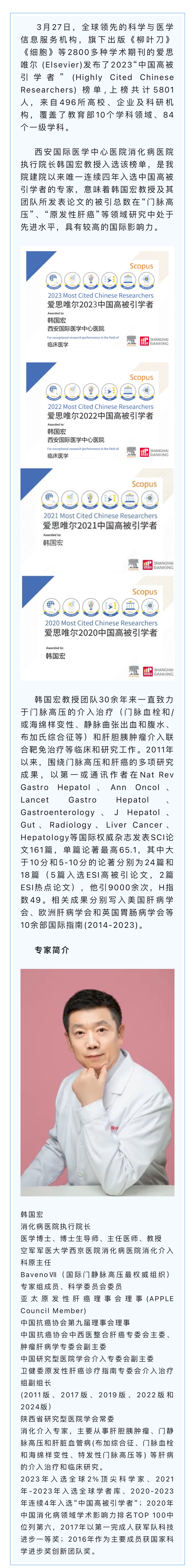 韓國(guó)宏教授連續(xù)4年入選“中國(guó)高被引學(xué)者”榜單!