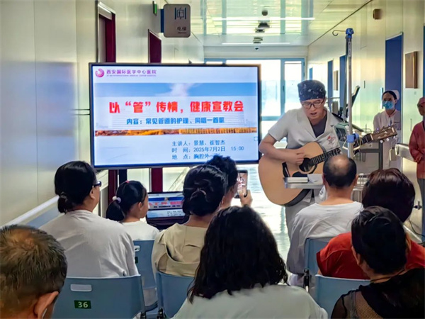 宣教會(huì)現(xiàn)場(chǎng)還充滿了溫暖的音符。崔智杰護(hù)士巧妙地將音樂療愈融入護(hù)理關(guān)懷,為在場(chǎng)患者深情彈唱了《隱形的翅膀》和《月亮代表我的心》。他表示:“醫(yī)護(hù)人員和家屬的心愿是一樣的,都期盼患者早日康復(fù)。希望音樂的感染力能為他們?cè)鎏響?zhàn)勝病魔的力量。”歌聲不僅傳遞了關(guān)懷,也進(jìn)一步拉近了護(hù)患距離,增強(qiáng)了患者積極面對(duì)疾病的心理建設(shè)。